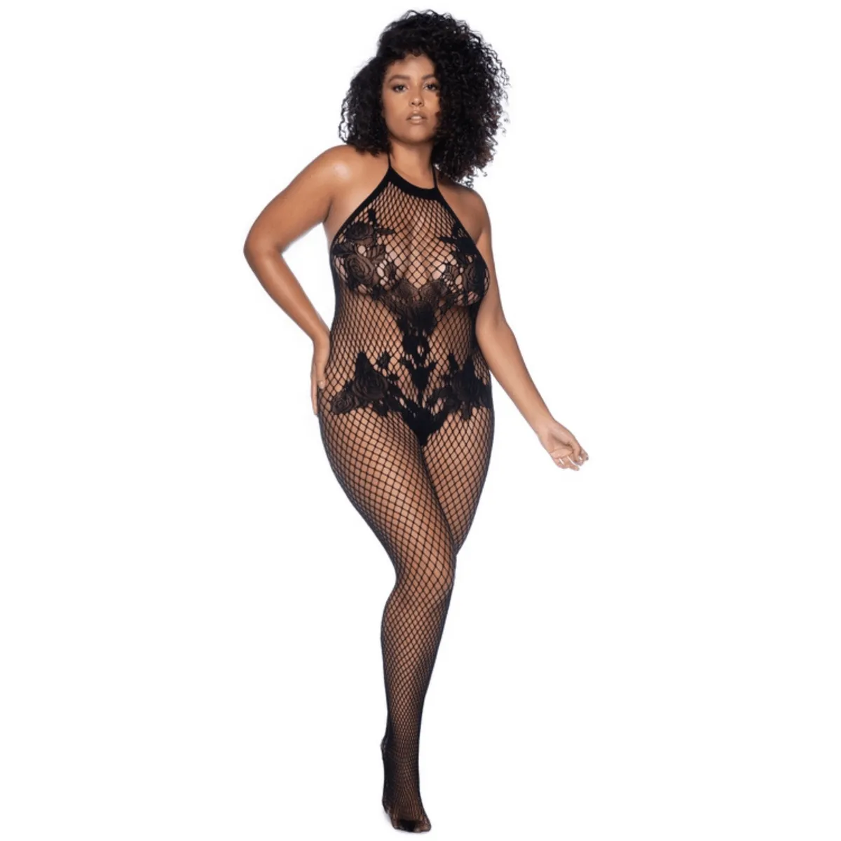 Osez révéler votre féminité avec cette combinaison grande taille en résille noire aux motifs floraux et dos échancré, pensée pour magnifier vos courbes avec chic et audace. Sa coupe ouverte à l’entrejambe et ses détails floraux placés avec soin créent une silhouette envoûtante, tout en garantissant un confort irrésistible.